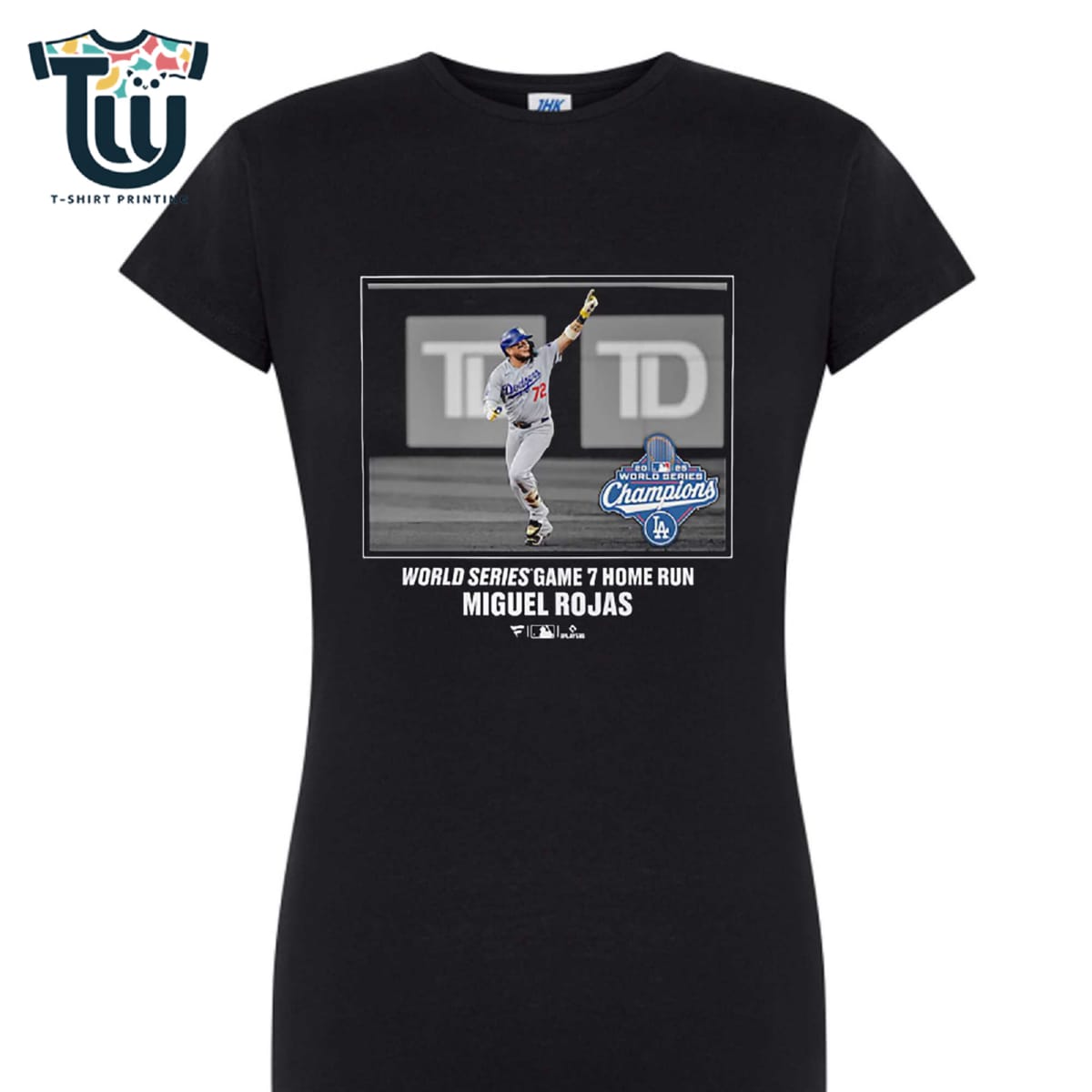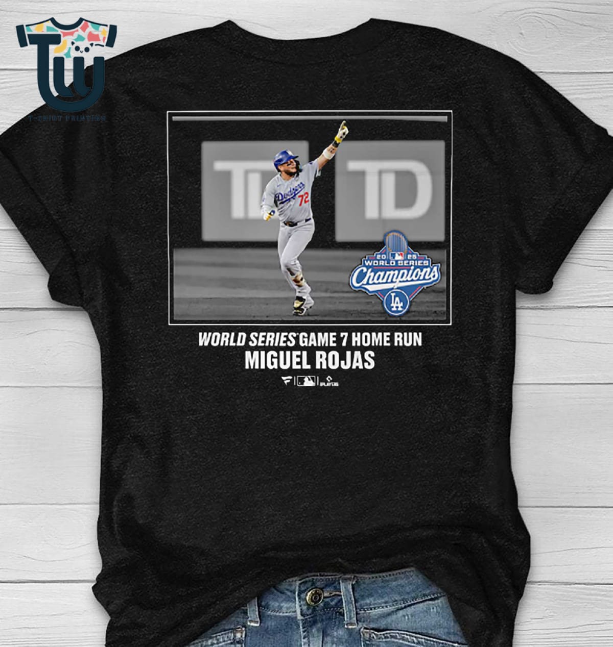 One of the standout features of this t-shirt is its vibrant and detailed printing. Utilizing state-of-the-art printing technology, it showcases a stunning graphic of Miguel Rojas in action, capturing the magic of the championship moment. The bold colors and intricate designs are not only visually striking but also durable, guaranteeing that your shirt will maintain its fresh appearance even after multiple washes. The breathable fabric provides exceptional comfort, making it perfect for those hot game days or casual outings where you want to represent your team with pride.