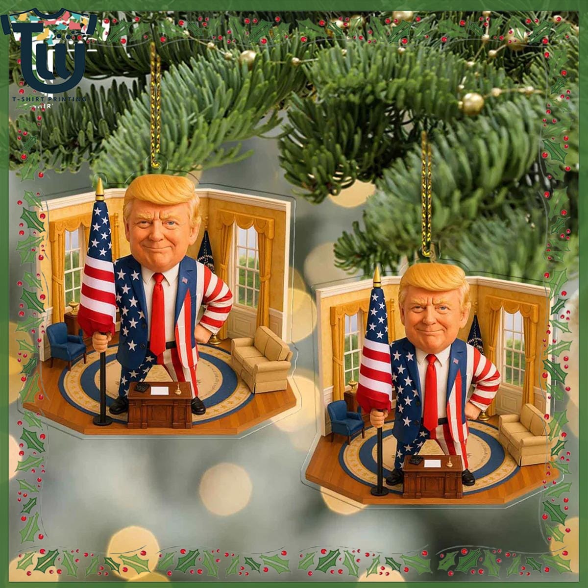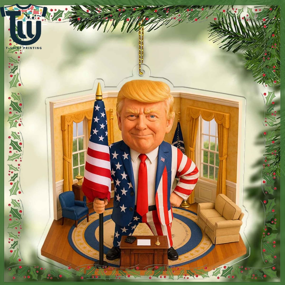 Bring a touch of political charm to your holiday décor with the President Trump Oval Office 2D Christmas Ornament. This unique piece captures the essence of a momentous era in American history, showcasing a finely detailed design that features President Trump in his iconic Oval Office setting. Tailored for the discerning collector and political enthusiast alike, this ornament is not just a decoration—it’s a conversation starter that adds a distinctive flair to your festive celebrations!